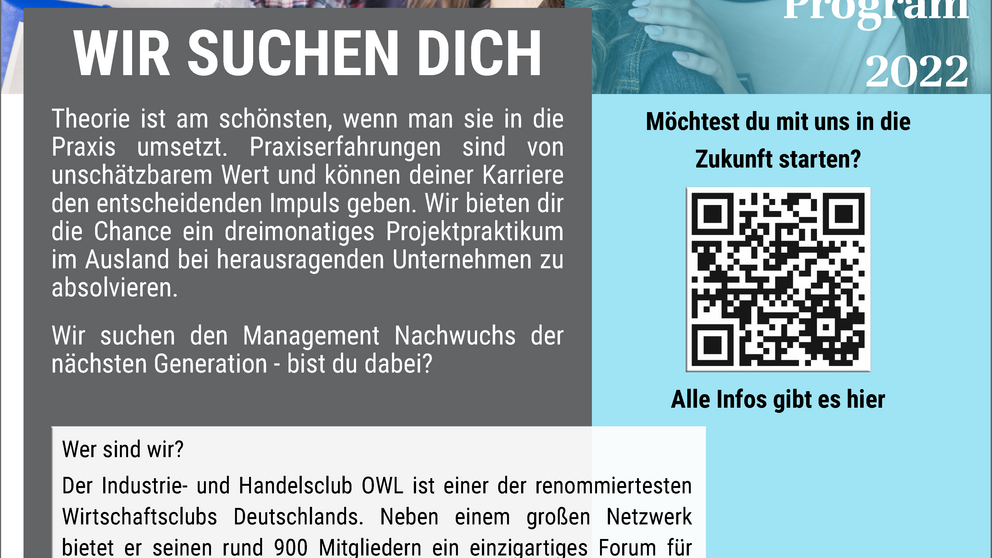 Studierende der Fakultät können sich ab sofort bis Ende Februar 2022 auf das International Partnership Program des IHC (Industrie- und Handelsclub Ostwestfalen-Lippe) bewerben. Die Förderung umfasst unter anderem ein Stipendium und ein dreimonatiges Auslandspraktikum in einem der Partnerunternehmen des IHC. Auskünfte erteilt Prof. Dr. Martin Schneider (martin.schneider@upb.de). Weitere Informationen und die Möglichkeit, sich zu bewerben, finden…
