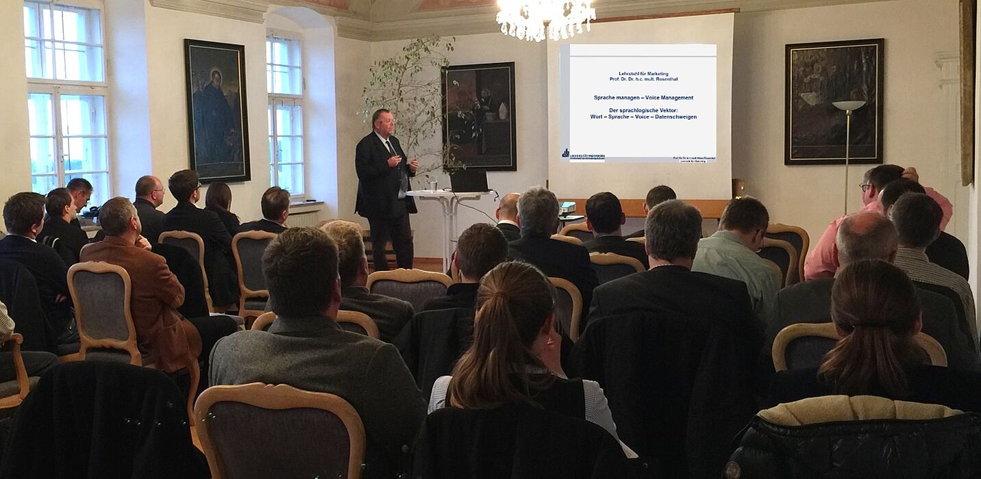Mit zwei Leitvorträgen konnten die Mitglieder aus der Fakultät für Wirtschaftswissenschaften den wissenschaftlichen Rahmen für die Praxisbeiträge eröffnen. <link www.uni-paderborn.de/person/42496/>Jun.-Prof. Dr. Michaela Geierhos</link> vom Heinz Nixdorf Institut referierte über neue technologische Sprachanwendungsmöglichkeiten und deren Probleme unter dem Titel „Warum Spontanität zum Problem für Sprachdialogsysteme wird“ und Tagungsleiter <link wiwi.uni-paderborn.de/dep1/marketing-prof-rosenthal/team/>Prof. Dr. Dr. h. c. mult. Klaus Rosenthal</link> aus Sicht verschiedener Leitwissenschaften mit dem Grundsatzthema „Der sprachlogische Vektor: Wort – Sprache – Voice – Datenschweigen?“. Eine knapp zweistündige Podiumsdiskussion unter lebhafter Beteiligung der IT-Manager rundete diesen Tagungsblock ab.