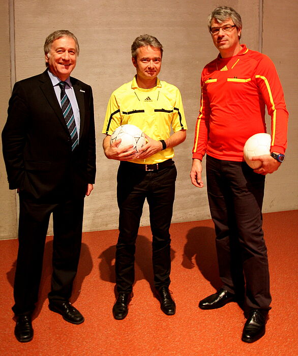 Mit dem Thema Fußballschiedsrichter befassten sich am Mittwoch Prof. Dr. Bernd Frick und Prof. Dr. Heiko Meier im Hörsaal G der Universität Paderborn. Der Vortrag fand im Rahmen der wissenschaftlichen Vortragsreihe „Zukunftsgestaltung durch Transdisziplinarität“ der fünf Fakultäten zum 40. Geburtstag der Uni Paderborn statt. Vor Beginn des Vortrags führten der Beatboxer August Klar sowie das Fach Musik und eine Tanzgruppe des Hochschulsports ihre Interpretation des Themas „Schiedrichter“ vor.