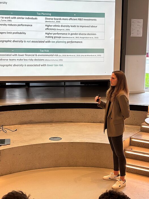 Am 29. Oktober 2025 stellte Kim Alina Schulz im Rahmen des PARSEC Brown-Bag Events ihre Forschung mit der Forschungsfrage „Who Works in the Tax Department? Examining the Impact of Workforce Diversity on Departmental Performance“ vor. In ihrem Vortrag präsentierte sie, wie Diversität in Steuerabteilungen mit steuerlicher Leistungsfähigkeit und Risiko von Unternehmen zusammenhängt.