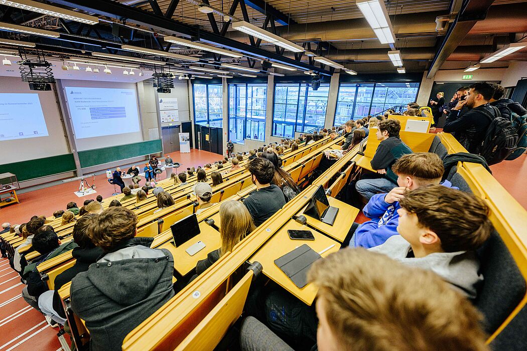 Foto (Universität Paderborn, Besim Mazhiqi): Zahlreiche neue Studierende füllten die Bänke des G-Hörsaals.