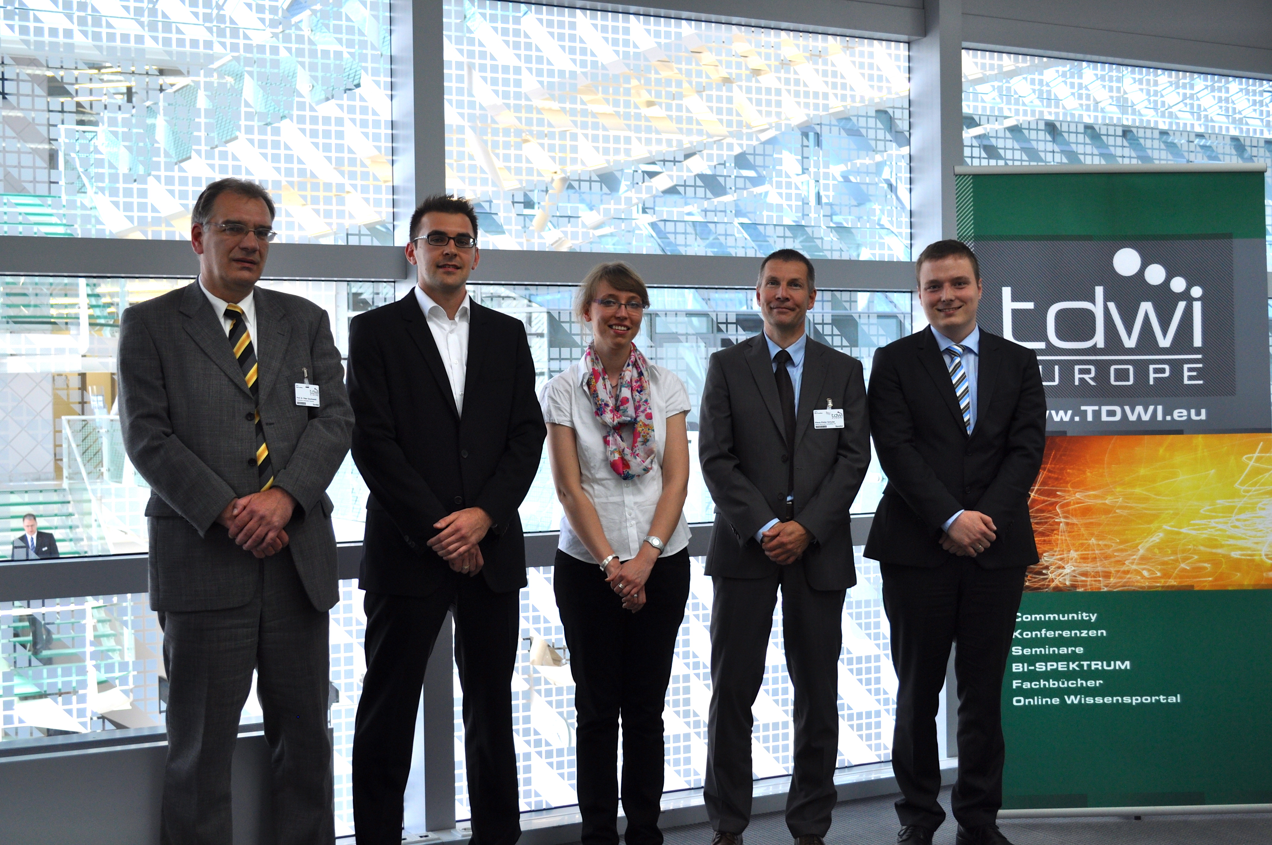 Foto (TDWI): Von links nach rechts: Prof. Dr. Peter Gluchowski (TU Chemnitz), Raphael Grytz (1. Preis, Universität Paderborn), Raphaela Seitz (2. Preis, Universität Stuttgart), Klaus-Dieter Schulze (Steria Mummert Consulting), Markus Hartmann (3. Preis, Universität Mannheim)