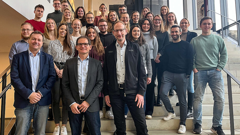 Foto (Universität Paderborn): Die Projektgruppen des Management Masters beschäftigten sich mit realen Problemstellungen der PaderSprinter GmbH und stellten diese den Vertretern des Unternehmens (Geschäftsführer Oliver Eikenberg, Kaufm. Leiter Andreas Frank und Bereichsleiter René Möller) sowie Prof. Dr. Kisten Thommes und Prof. Dr. Martin Schneider vor.